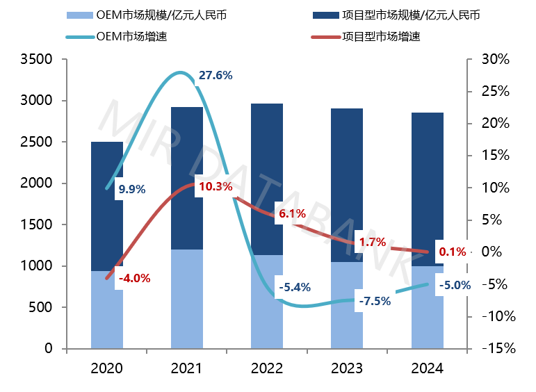 按照MIR DATABANK数据表白,2024年中国OEM从动化市场规模约为1000亿元,同比下降5%,同比增加0。1%,且市场曾经持续四年呈现增速放缓态势。